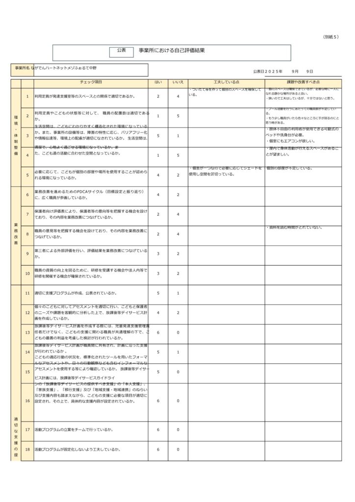 厚生省放課後デイサービスガイドに基づく 事業所における自己評価結果報告(令和7年9月)メゾふぉるて中野